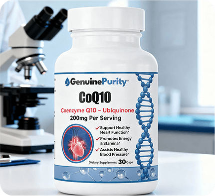 GenuinePurity® CoQ10 delivers a clinically researched 200 mg dose of naturally sourced Ubiquinone, a potent antioxidant essential for cellular energy production, cardiovascular performance, and overall vitality. This premium formula is designed to support healthy circulation, mitochondrial efficiency, heart function, and long-term cellular resilience.
